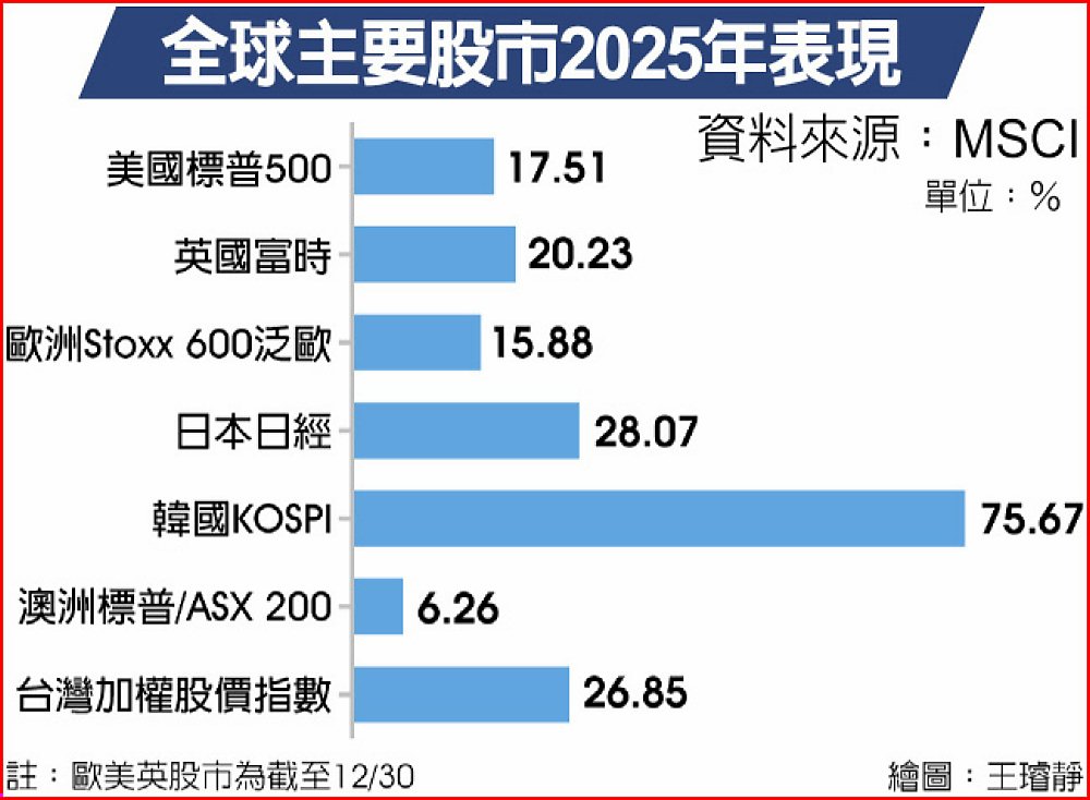 全球股市已從2025年4月「解放日」關稅衝擊的暴跌中恢復,2025全年累漲約21%,此為七年來第六次實現雙位數漲幅,市值再增加15兆美元。同樣的,在AI熱潮助攻下,亞股也寫下八年來最亮眼表現。其中,韓股以全年75%漲幅,表現居全球第二。