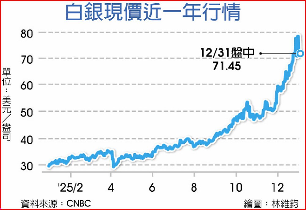 此外大陸官方日前罕見宣布自2026年1月1日起,白銀出口由配額管理改為實施出口許可證制度,即須獲批准才能出口,市場憂慮大陸將收緊白銀供應,另,白銀期貨2025年12月31日收跌4.27%,每公斤報人民幣(下同)17,074元,但2025年全年漲幅仍高達124.6%。