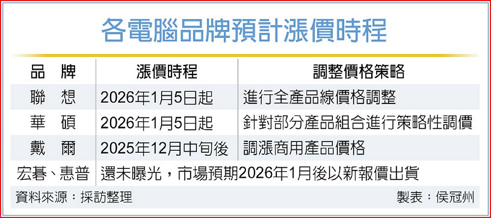 聯想2025年12月1日向客戶與合作夥伴發出產品調價函,預告自2026年1月5日起,將針對全產品組合實施價格調整;而華碩同樣在12月底發出產品價格調整說明,2026年1月5日起,針對部分產品組合策略性價格調整。