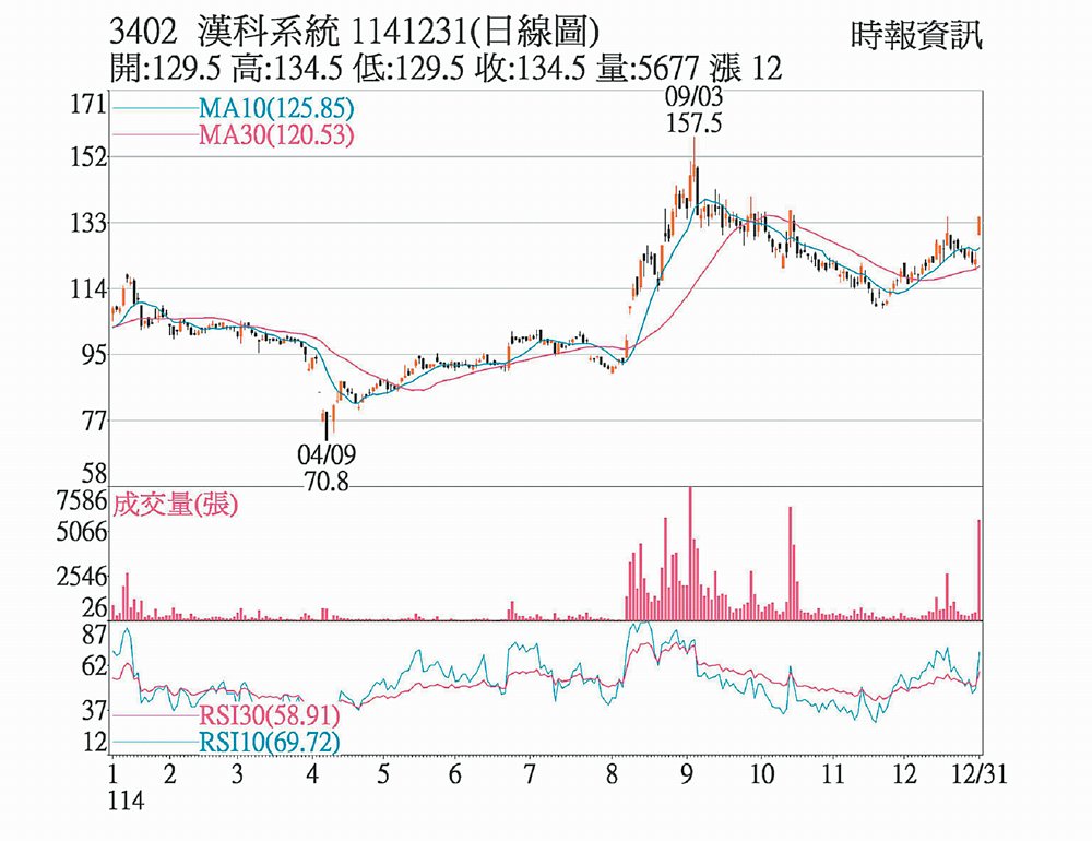 漢科(3402)走勢原本沿季線震盪,31日多方資金強攻,早盤亮燈漲停,並以134.5元漲停收市,持平前波高點,技術面上,已收復所有短中長期均線,同時,日成交量放大至逾5千張以上的大量,價量具揚帶動日KD低檔形成交叉向上,後市有機會持續向上攀升。