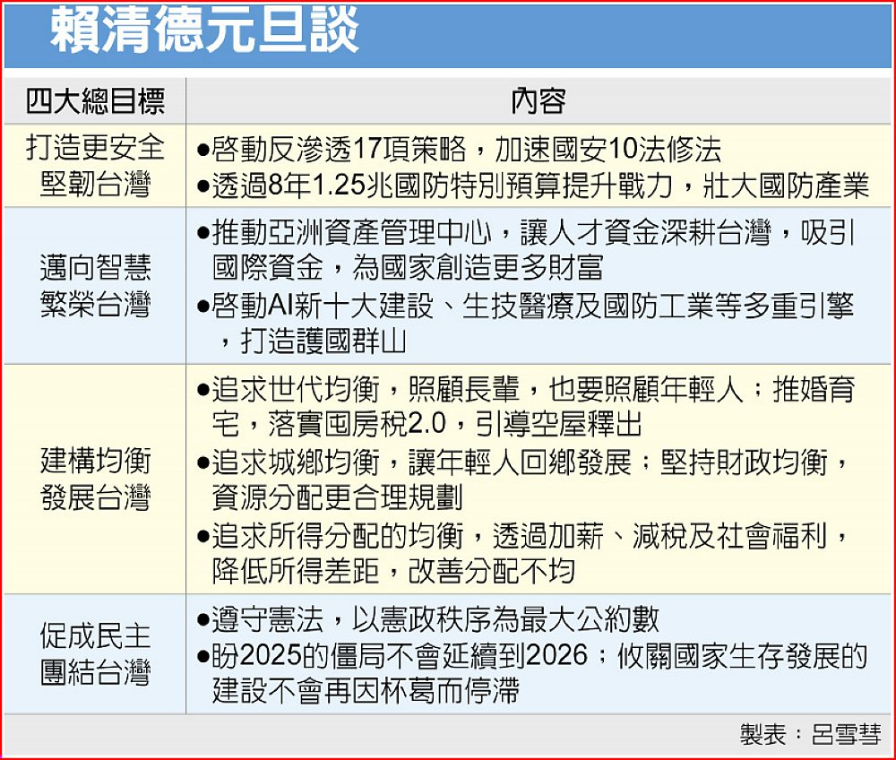 新的一年,他說,要繼續大步向前走,達成四個總目標。一、打造更安全、堅韌的台灣。今年要加速推動國安十法修法,透過8年1.25兆國防特別預算投資,全面提升戰力,壯大國防產業,強化國家安全與社會安定。