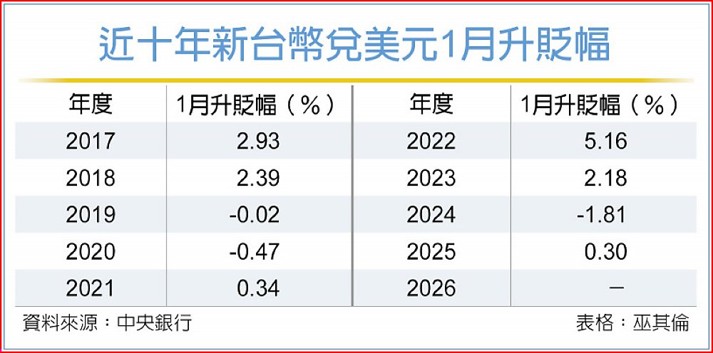 回顧2017年以來近十年新台幣元月升貶幅,過去有六年走升、僅三年走貶,新台幣仍是相對強勢,去年1月升值0.3%,2026年1月不排除複製去年行情,連二年元月走揚機率高。而整體亞幣方面,美國聯準會2026年延續降息,但亞洲主要央行貨幣政策各有考量,亞幣1月可能先各自「走自己的路」。