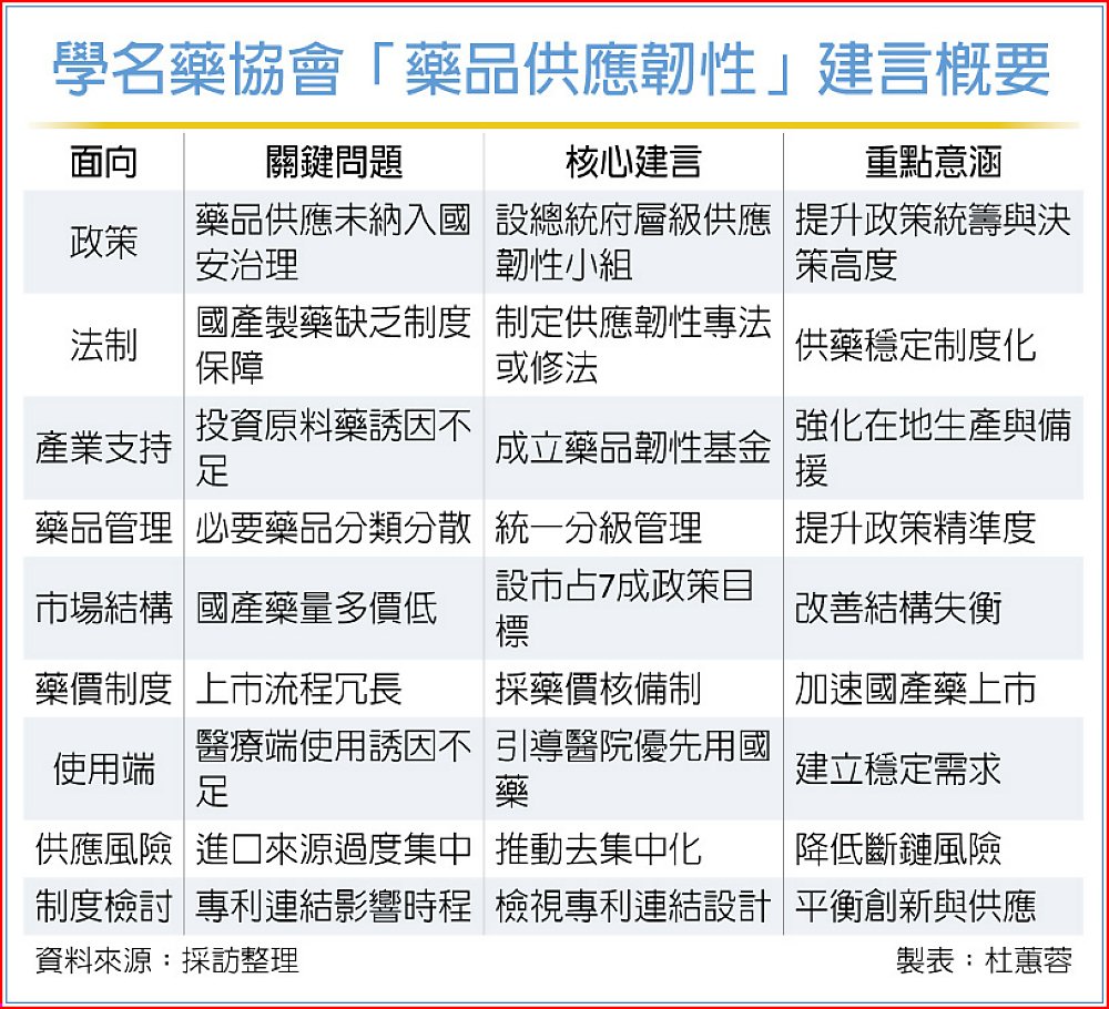 在政策架構上,協會建議由總統府健康台灣推動委員會下設「藥品供應韌性小組」,統籌衛福部、經濟部、健保署等跨部會資源,作為藥品供應政策的最高協調平台,避免各自為政。並主張於《生技醫藥產業發展條例》中增設國產製藥專章,或另行制定《藥品供應韌性專法》,將藥品供應穩定納入長期制度性保障。