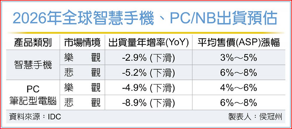據IDC最新報告,DRAM、NAND、SSD價格大幅上漲,手機各大品牌可能採取調價或調規策略,具體影響視品牌定位而定。預估2026年手機市場在樂觀情況下,出貨量會有2.9%的下滑,平均售價(ASP)漲幅上看5%;而情況悲觀的話,出貨量下滑幅度恐達5.2%,ASP漲幅則上看8%。