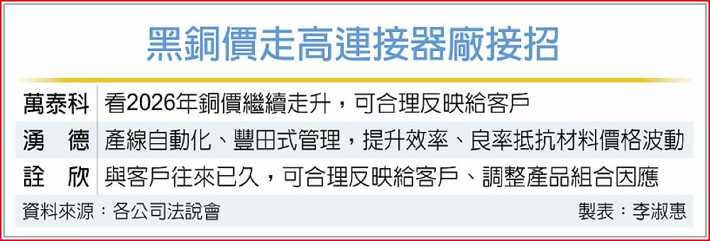 銅價續創歷史新高,萬泰科(6190)、湧德(3689)、詮欣(6205)齊看今(2026)年銅價續漲,銅價占連接器、線材有相當程度比重,特別是線材比率更高,國內連接器廠多半與客戶往來已久,展望今年銅價看回不回,可望適度轉嫁,或透過產品組合調整平衡成本。