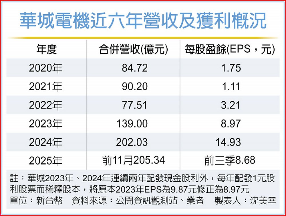 本土法人出具報告,依據華城前11月營收205.34億元,年成長23%,推估2025年營收突破240億元;由於外銷營收占比提升至57%,毛利率因產品結構轉佳而達39.6%,費用率也因分攤部分對等關稅6%而增加至15.8%。第四季無須認列匯損等業外損失,預期2025年EPS為14.3元,略低於2024年14.93元。