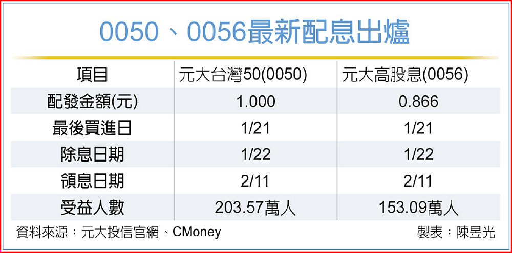 二大重量級ETF 0050元大台灣50、0056元大高股息最新配息出爐,每受益權單位分別配發1元及0.866元,同步於22日除息、2月11日發放配息,預計將有超過356萬名投資人將可在農曆過年前領到配息紅包。