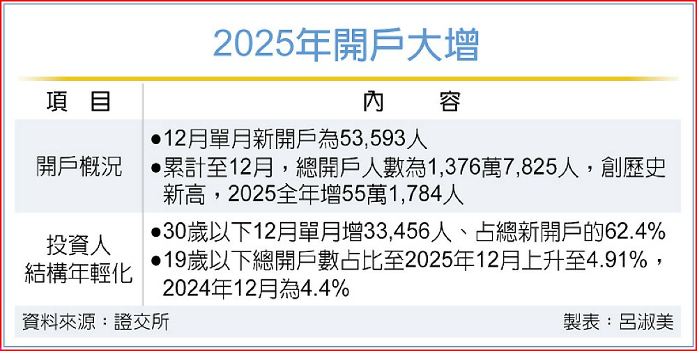 臺灣證券交易所2日公布,2025年12月台股集中市場總開戶數飆高至1,376.78萬人、月增5.36萬人,以歷史最高總開戶數畫下年度完美句點,其中,30歲以下「少年股神」12月新增33,456人、占總新開戶的62.4%,投資人結構持續年輕化。2025年全年新開戶數為55.18萬人。