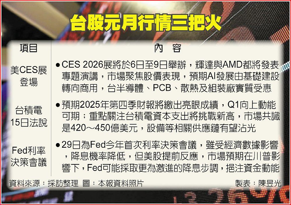 萬寶投顧總監蔡明彰表示,台股1月將關注三大事。第一是美國CES展,輝達、AMD等AI股表現為關注重點。其次,台積電法說預計將釋出去年第四季強勁財報,而29日為Fed今年首次利率決策會議,雖受經濟數據影響,降息機率降低,但美股2025歲末已提前反應,市場預期在川普影響下,Fed可能採取更為激進的降息步調,對資金動能有所挹注。