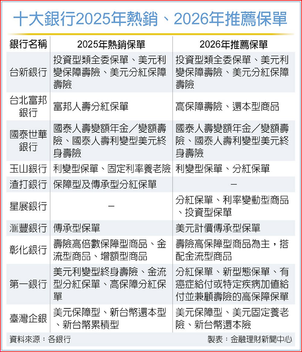 台新銀指出,2026年市場估美元長期趨貶,預料傳統型保險會逐漸側向以美元保障壽險為優先,如美元利變保障及美元分紅保障;投資型保險仍以類全委帳戶為主。台北富邦銀行2026年持續推薦高保障壽險,滿足客戶資產保全與傳承需求,另也推薦還本型商品。