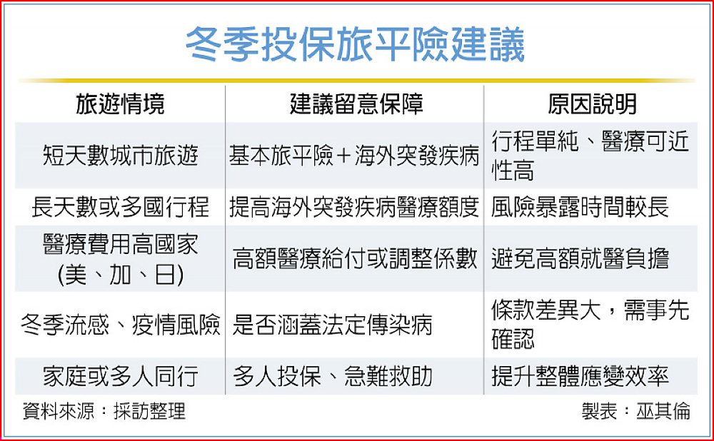 整體來看,隨跨年、春節等長假接力登場,國人出國旅遊熱度持續升溫,旅平險也從過往「基本配備」轉為「情境化服務」。產險與壽險業者一方面透過與航空公司、線上平台整合投保流程,降低民眾投保門檻;另一方面強化海外醫療、急難救助等高需求保障內容,因應高醫療費用國家與突發風險。