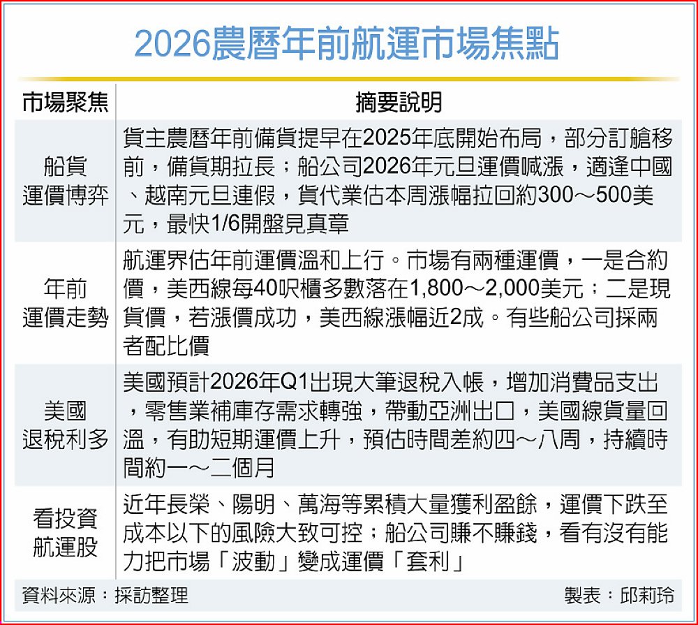 貨櫃航運2026年開局上演價量上行戲碼,農曆年前出貨需求,及美國將迎來史上最大退稅潮,將帶動運量增加,支撐短線運價漲勢。市場分析,農曆年前搶出貨需求將帶起一波運量高峰,讓船公司元旦喊漲運價有底氣,最快6日開盤見真章。