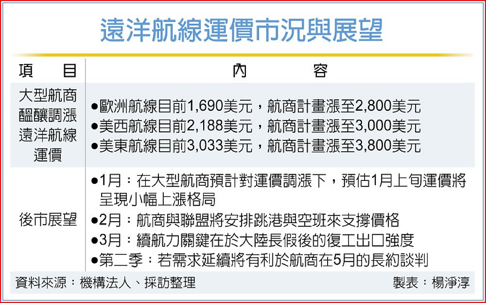 船公司、貨代業預估,農曆年前運價將呈溫和上行,在運力供給過剩下,船公司會透過調控艙位支撐運價,也為3月起美國線超大型客戶長約價定錨,累積談判籌碼。