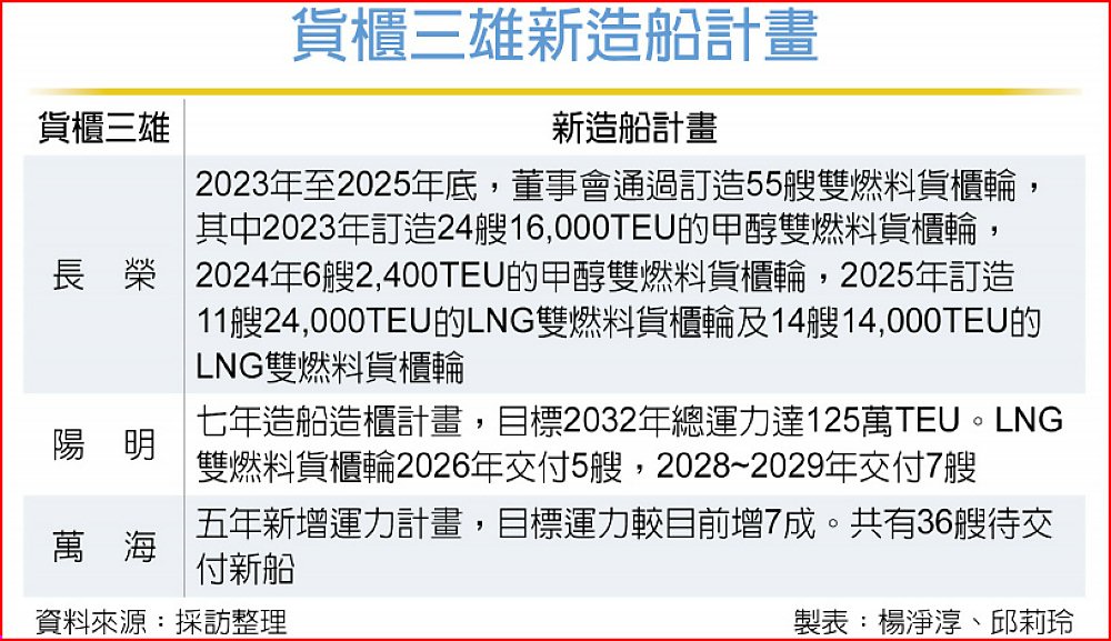 長榮近三年合計訂造55艘雙燃料貨櫃輪;陽明2025年投資610億元新造13艘貨櫃輪,朝2032年船隊總運力達125萬TEU(20呎櫃)邁進;萬海制定五年計畫,目標躋身全球前十大航商。