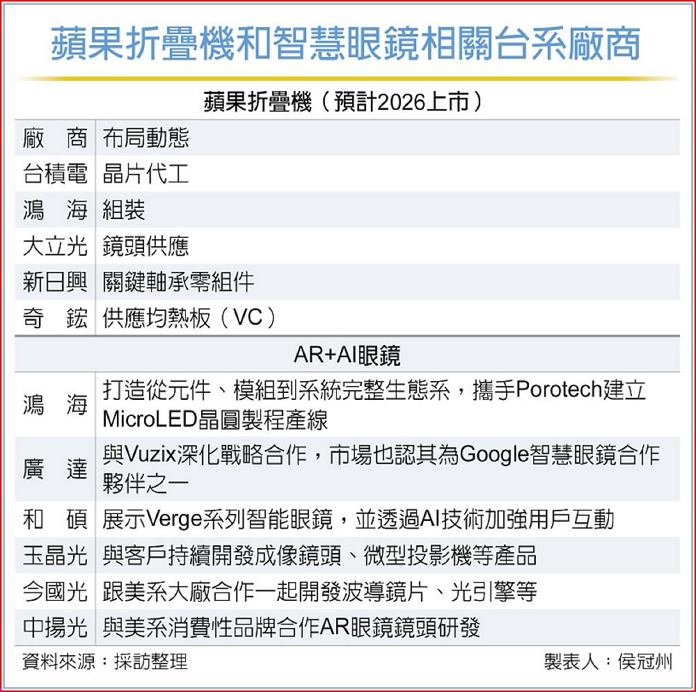 AI算力發展突飛猛進,不僅智慧眼鏡走向日常裝置,多元AI應用更成為手機品牌提振折疊機銷售的新利器,加上市場普遍預期蘋果將在2026年加入折疊機戰場,為折疊手機市場再注入一股活水,替台鏈如台積電、大立光、鴻海、新日興、奇鋐等未來營運再添動能;而看好智慧眼鏡成為下一個AI載具,台系光學廠和EMS業者也鴨子划水積極布局。