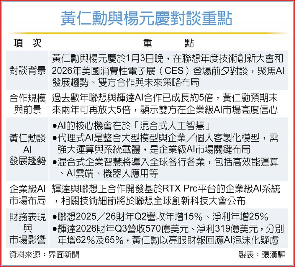 在聯想年度技術創新大會和2026年美國消費性電子展(CES)登場前夕,輝達執行長黃仁勳與聯想集團執行長楊元慶3日進行公開對談,兩大AI產業巨頭針對人工智慧(AI)技術演進、雙方合作成果與未來布局交換看法,均對未來AI市場前景感到樂觀。黃仁勳直言,未來兩年雙方合作規模「有機會再成長五倍」。