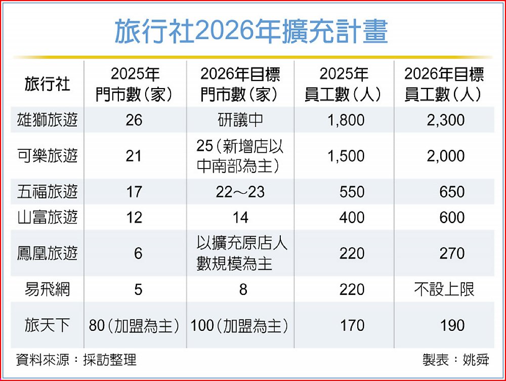 看好台灣出境遊市場持續成長,雄獅旅遊、可樂旅遊、五福旅遊、山富旅遊、鳳凰旅遊、易飛網、旅天下等指標旅行社,2026年將擴大通路布局、實體門市拓點,並增加人力且上調薪資、增加員工福利,以達徵才、留才目的,全面強化營運動能搶商機。