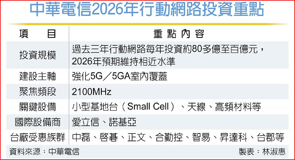中華電信2026年行動網路建設,聚焦擴大5G/5GA室內覆蓋,過去三年行動網路每年投資80多億至百億元,2026年資本支出尚未出爐,但預期與近年相當規模。由於5G室外涵蓋已大致完成,據了解,2026年網路建設將聚焦強化室內覆蓋。