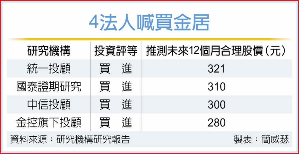 中信投顧、國泰證期研究賦予金居的推測合理股價各為300元與310元,投資評等皆為「買進」,對照金居股價2日一度超越300元,幾乎已經達標法人期望值,緊接著若AI需求進一步端出更佳展望,目標價更上層樓值得期待。