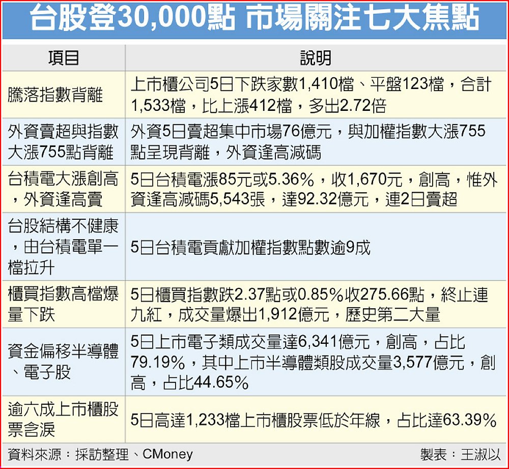 台股5日終場漲755點收30,105點,成交量放大至8,007億元創史上最高,因指數過於急漲,且台積電一夫抵萬軍,資金完全偏倚電子族群,市櫃合計下跌加平盤家數為上漲的3.72倍、1,233家公司股價低於年線,且櫃買指數不到半個小時就翻黑,法人圈對台股登上30,000點憂喜參半。