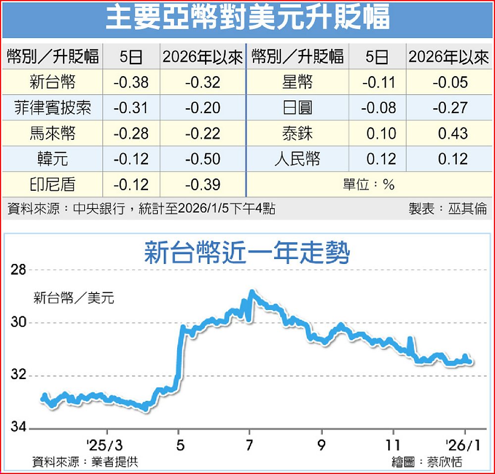 台股5日登上3萬點創歷史新高,外資熱錢湧入下,推升新台幣匯價早盤升破31.4元,但美國對委內瑞拉採取軍事行動,美元指數反應走高,及最關鍵原因為壽險為因應2026年起適用會計新制,連日加碼大買美元,新台幣中午過後加速回貶,終場重挫逾1角,直接貶破31.5元關卡。