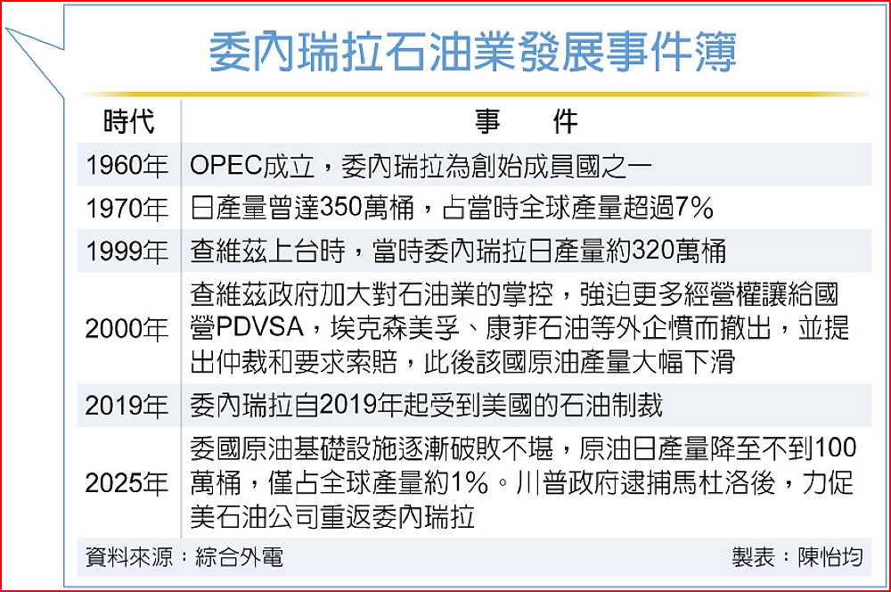 市場仍在評估後續發展,5日布蘭特原油價格小跌約0.15%至每桶60.66美元、西德州中級原油跌0.09%至57.27美元。據悉,白宮和國務院官員近幾周已告知美石油業高層,若希望20年前遭委內瑞拉沒收的資產得到補償,須盡快返回委內瑞拉,並在當地投入大量資金以重振受創的產油業。在2000年代,已故強人總統查維茲掌權時期,委內瑞拉政府曾沒收國際石油公司資產,因後者拒絕依照查維茲要求給予委內瑞拉國營石油公司PDVSA更大營運控制權。美石油大廠雪佛龍(Chevron)是留在當地的業者之一,參與談判並與PDVSA成立合資企業,埃克森美孚(Exxon Mobil)和康菲石油(ConocoPhillips)則選擇離開並提起仲裁。
