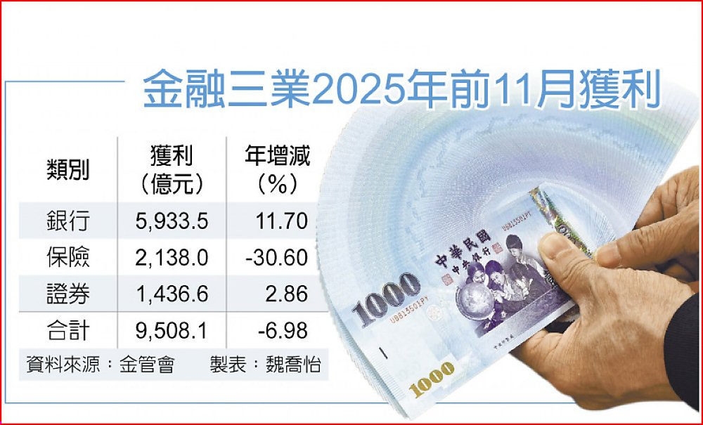 金管會公布2025年前11月金融三業的銀行、證期投信、保險,稅前盈餘達9,508.1億元,年減幅從11%收斂至6.98%,由於第四季獲利面維持動能,前11月已寫下史上次高紀錄,12月雖然銀行有望挑戰新高,但壽險面臨稅前盈餘30%要提存外價金的挑戰,因此全年獲利要挑戰新高有難度。
