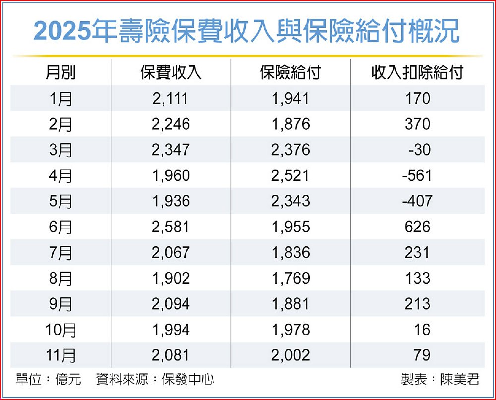 揮別解約潮,壽險保費流動性無虞。保發中心5日公布,2025年11月壽險總保費收入2,081億元,為兩個月高點,保險給付也同步突破2,000億元、達2,002億元,為六個月新高。2025年11月保費呈現金淨流入79億元,連六月呈淨流入。