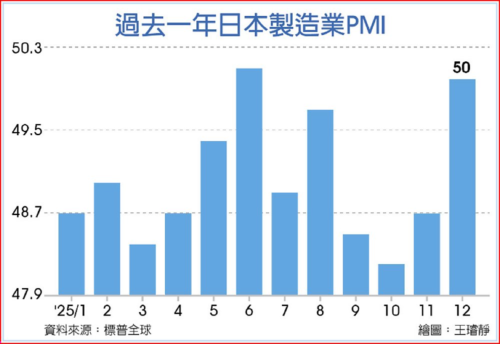 金融數據供應商標普全球(S&P Global)5日公布,日本2025年12月製造業採購經理人指數(PMI)從11月的48.7升至50榮枯線,結束連五個月萎縮趨勢,並創去年6月以來最高。顯示日本製造業活動於去年底止跌回升,原因是需求下滑速度放緩。