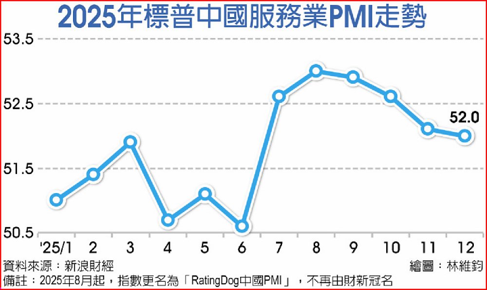 標普全球/RatingDog於5日聯合公布,2025年12月RatingDog中國服務業採購經理人指數(PMI)較前個月小跌0.1點降至52。雖仍高於50榮枯線,但指數降至6個月低,顯示服務業擴張動能有所放緩。