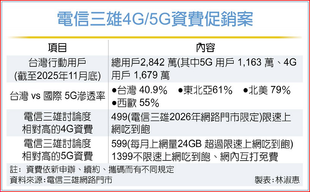 業者認為,4G 499雙飽(上網吃到飽、網內互打免費)是電信市場五家業者價格廝殺下的產物,也是全球最便宜的4G吃到飽資費,而5G雙飽門檻1,399元,也比美國、韓國等主要國家便宜,例如T-Mobile最新5G吃到飽約50美元,台灣5G滲透率緩步成長的主要原因,其實還在於「4G已經夠用,而且便宜」的消費心態,未來調整5G資費該如何設計才具吸引力?業者強調還需通盤檢討。