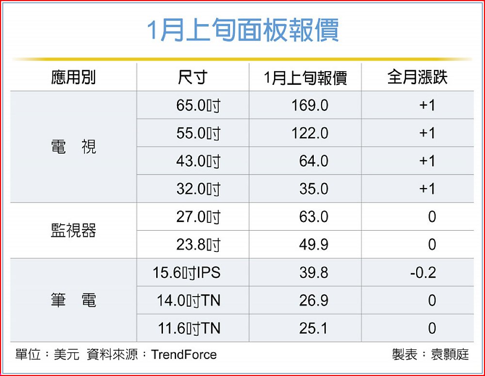 筆電面板需求1月轉弱,部分品牌因為上一季度提前備貨,第一季需求動能將放緩,加上記憶體缺貨與價格大幅調漲帶來的衝擊,預估品牌客戶將持續增強對其他主要零組件砍價的力道,而持續處於供過於求狀態的筆電面板將首當其衝,無論是檯面價格或是檯面下優惠,品牌要求跌價的壓力正持續增強。目前預計1月份筆電面板價格將呈現跌價趨勢,且跌幅稍擴大,除了TN機種可維持持平外,其餘IPS機種預估將下跌0.2美元。