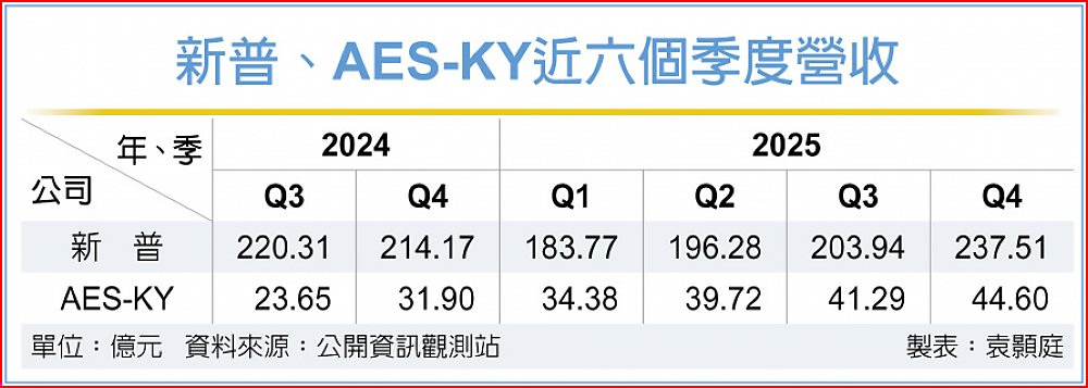 AES-KY(6781)受BBU出貨攀高帶動,2025年12月、第四季、全年營收均創歷史新高,12月營收突破15億元,第四季營收44.6億元,全年合併營收突破160億元大關。新普(6121)也受惠漲價效應,12月營收表現優於預期,2025年合併營收821.5億元,年增率轉正、來到2.65%。