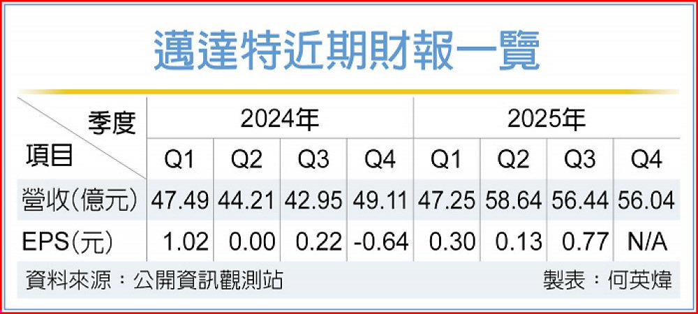 邁達特2025年12月營收19.52億元,年增11.84%,第四季營收56.04億元,年增14.11%,累計2025年營收218.38億元,年增18.84%,創歷史新高紀錄。