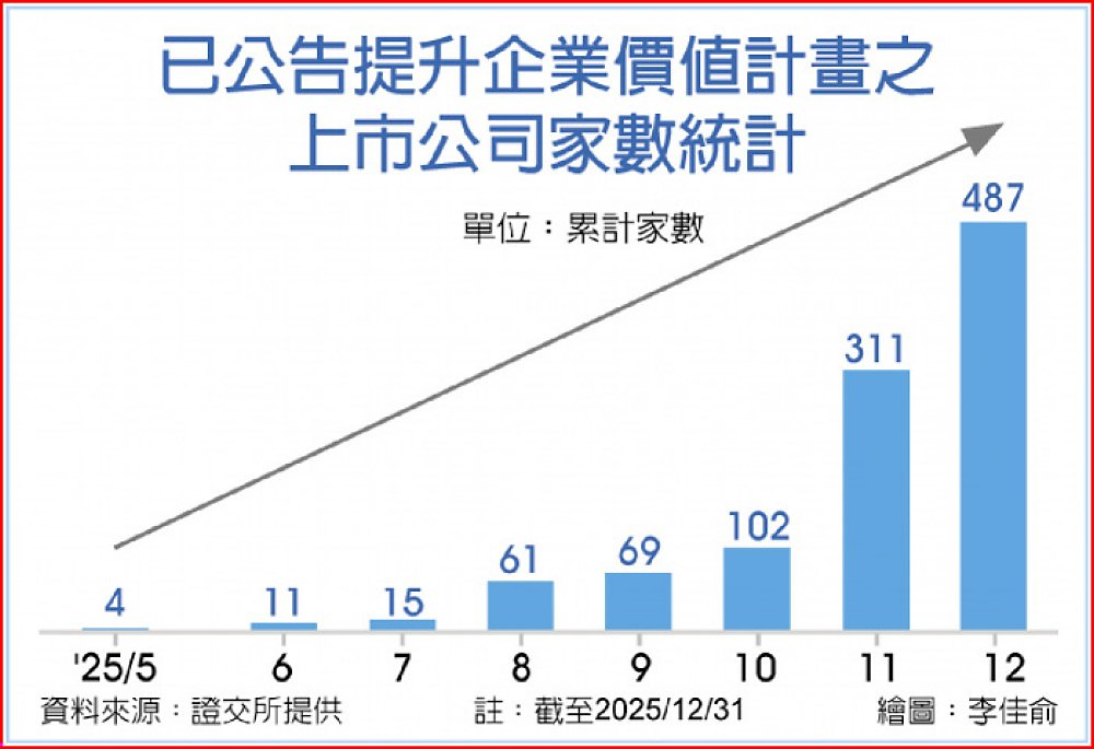 由於股價跌不休,據統計,12月一口氣有175家上市司加入「Power UpTW 提升企業價值計畫」,截至114年12月31日止,計有487家上市公司響應並公告相關計畫,占上市公司總家數45.81%。