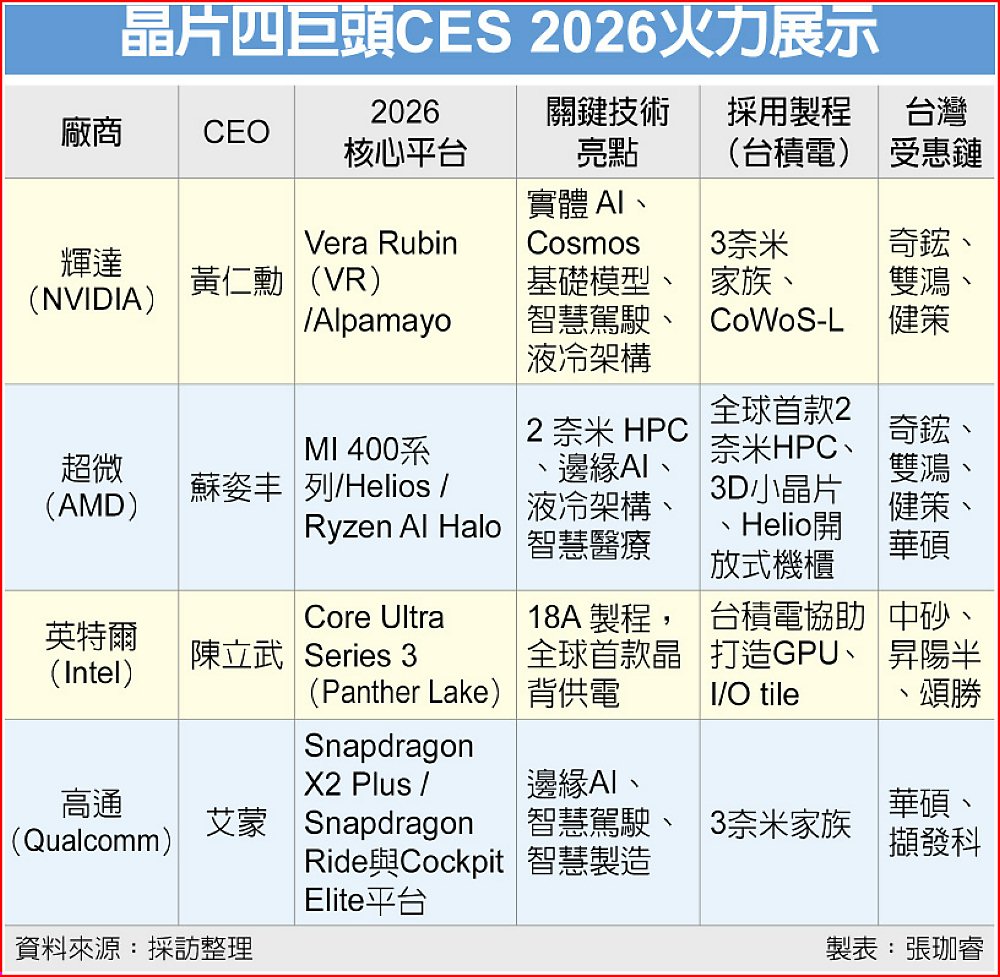 蘇姿丰則將2026年定調為「AI PC世代」,宣告個人電腦正由生產力工具進化為智慧夥伴。AMD在CES發表新一代資料中心與客戶端平台,並搶先導入台積電2奈米製程。