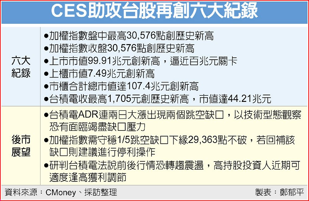 台積電15日法說會將登場及消費性電子展(CES)雙利多助攻,台股連四個交易日創高,5日登30,000點後,6日漲471點或1.57%收30,576點,再寫上市市值達99.91兆元將過百兆元等六大紀錄,連四日共大漲1,869點或6.51%。