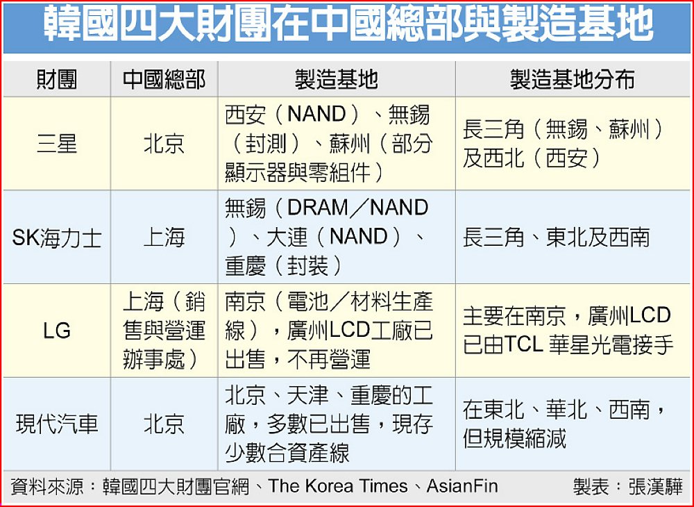 隨美中緊張升溫,三星、SK、LG與現代調整在中國的布局。上海與長三角集中國區總部與供應鏈協調功能,製造則分布西安、無錫、蘇州等地,涵蓋晶片、面板與車用組裝。業界認為韓企短期難以脫鉤中國,上海仍是中韓高科技供應鏈的關鍵樞紐。