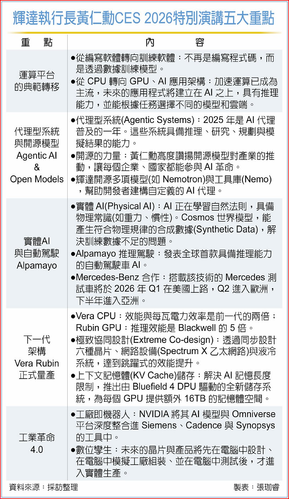 NVIDIA(輝達)執行長黃仁勳美西時間6日於CES 2026宣告,AI運算正式邁入「思考與推理」新紀元。他直言,摩爾定律已明顯放緩,單靠製程微縮已無法支撐AI效能持續躍進。法人指出,輝達最新AI伺服器平台Vera Rubin(VR)採「極致協同設計」(Extreme Co-design),帶動半導體產業迭代發展,包括台積電在先進封裝、CPO技術上的提升,對液冷散熱、記憶體與高速互連族群也可望受惠。