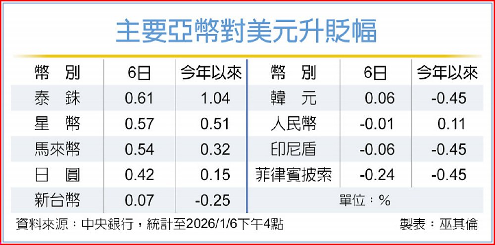 主要亞幣6日多大漲,漲幅達0.06%~0.61%,僅有人民幣、印尼盾以及菲律賓披索逆勢走貶。