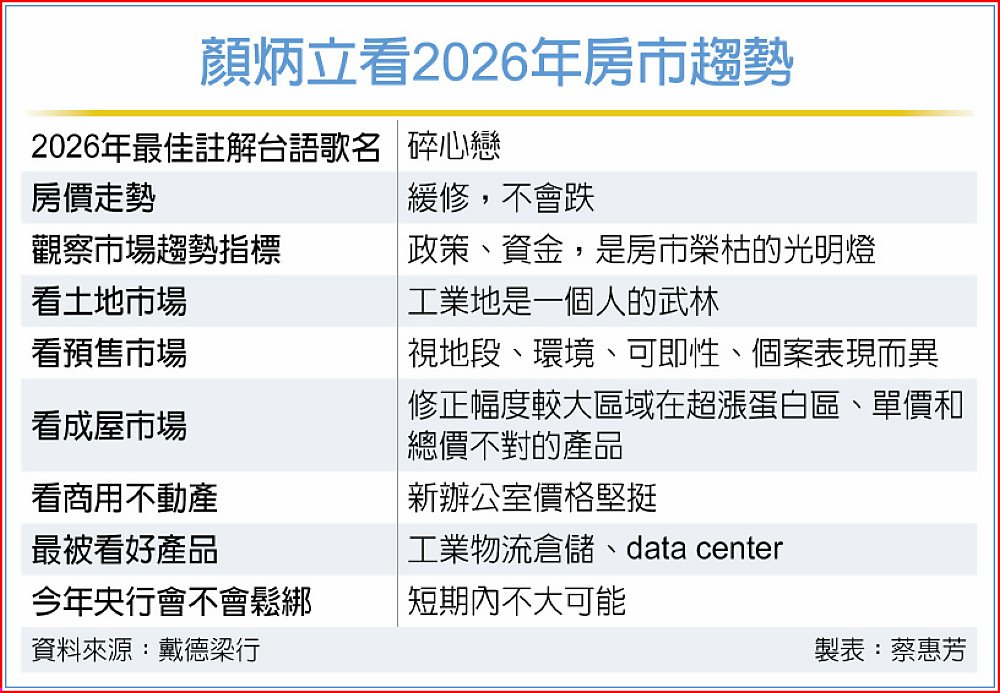 每年初顏炳立都會以一首台語歌的歌名,來註解未來一年的房市預期,從2013年迄今,都無一失準,顏炳立這次以「碎心戀」來形容2026年房市,對於市場碎、對於房價碎。
