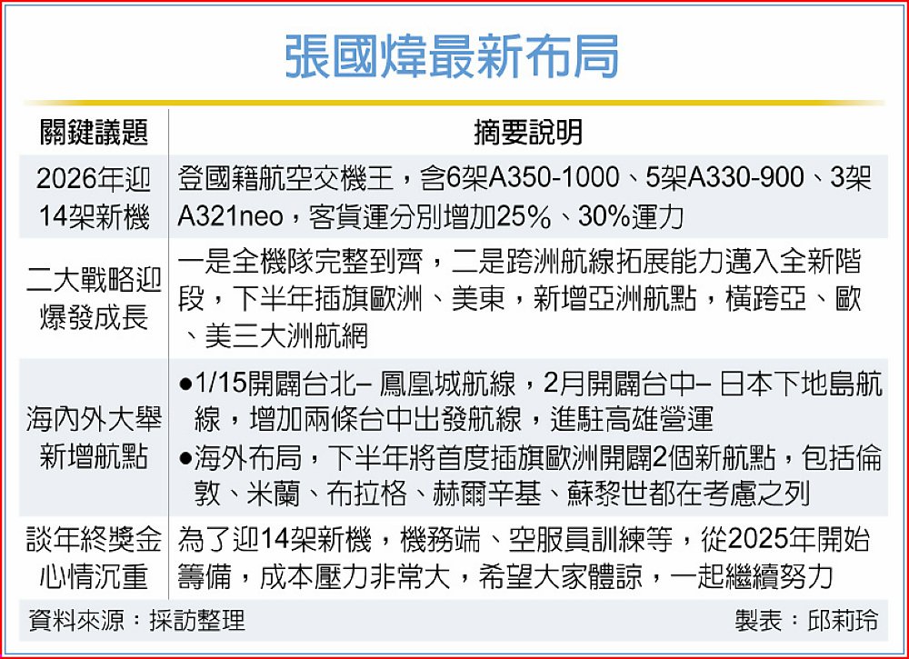 2026年開局,星宇1月15日開闢台北—鳳凰城航線,2月開闢台中—日本下地島航線,增加二條台中出發航線,也將進駐高雄營運;海外布局方面,除了持續開闢北美與亞洲航點,下半年將首度插旗歐洲開闢二個新航點,包括倫敦、米蘭、布拉格、赫爾辛基、蘇黎世都在考慮之列,2026年底、2027年初飛進大洋洲市場。