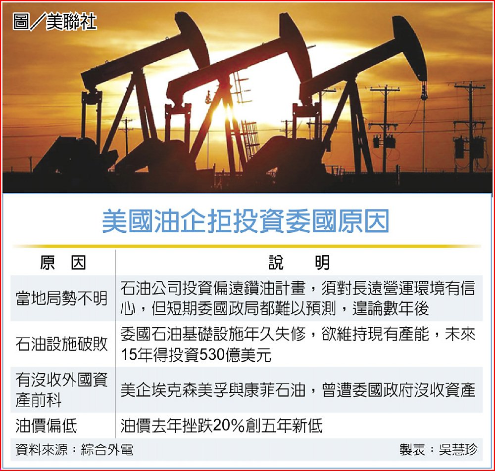 美國總統川普向國內石油巨頭喊話前往委內瑞拉投資,協助重建當地老舊失修的能源基礎建設,政府打算提供補貼,委國石油業可望在18個月內重啟運作。但當地局勢不明、委國石油設施破敗及油價偏低等因素,難吸引美國油企投資。