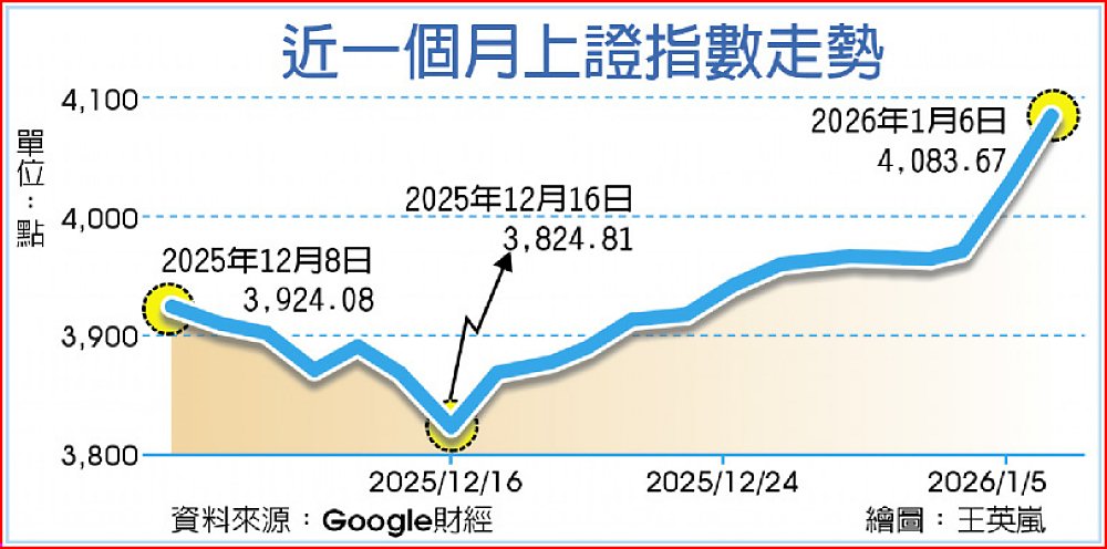 大陸股市近期展現強勁多頭氣勢,延續開年以來的火熱行情。1月6日,上證指數日線拉出罕見的連13紅(當日收盤價高於開盤價),續創33年來最長連紅紀錄。在多方買盤湧入下,上證指數不僅站穩4,000點大關,更創下逾10年來的收盤新高,投資氣氛顯著回溫。