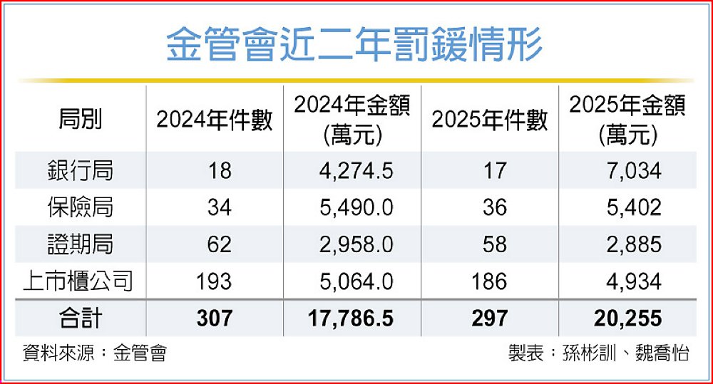 金管會2024年裁罰307件,裁罰金額1億7,786.5萬元,2025年比2024年還少十件、降至297件,開罰2億255萬元,僅銀行局2025年裁罰金額較2024年上升,其他包括保險局、證期局裁罰金額都較2024年減少。