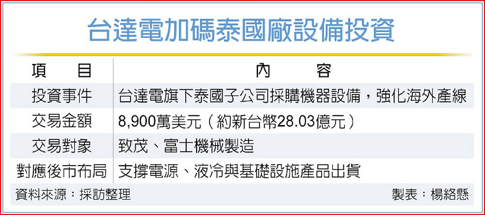 電源廠台達電持續加碼泰國廠產能,6日公告旗下泰國子公司泰達電向致茂及富士機械製造採購機器設備,累計投資金額約8,900萬美元(約新台幣28.03億元),相關設備將供生產使用,顯示海外產線配置與製程能力持續推進。