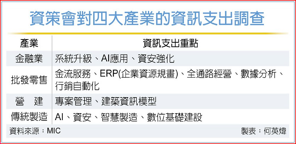 MIC分析,2024至2026年間,台灣四大產業資訊支出呈現結構性改變,「由設備轉向應用、由建置轉向優化」趨勢。金融業聚焦系統升級、AI應用及資安強化。批發零售業加速雲端導入與新業務應用。營建業以基礎系統更新及專案需求為主。傳統製造業則在通膨及國際政經不確定性下,聚焦AI導入與既有系統優化。