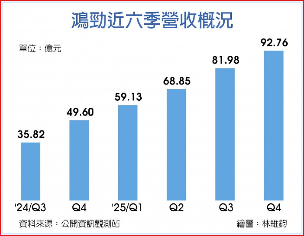 鴻勁2025年12月營收33.29億元,較上月成長10.4%,也較前一年同期成長74.53%,2025年第四季營收92.76億元,較上一季成長13.15%,也較前一年同期成長87%,累計2025年全年營收302.71億元,年成長高達116.34%。