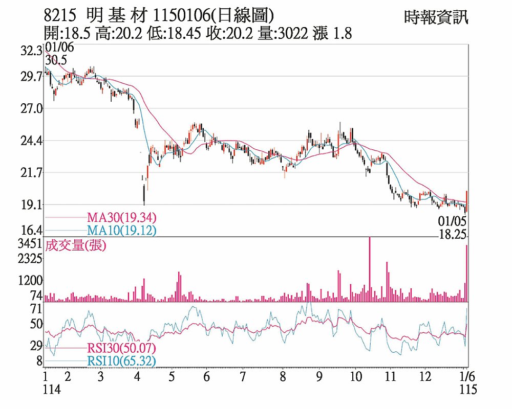 面板類股近期成為盤面焦點,6日偏光片廠明基材(8215)股價開高走高,午盤大單敲進,攻上漲停鎖死,終場就以漲停價20.2元作收,成交量放大到3009張。
