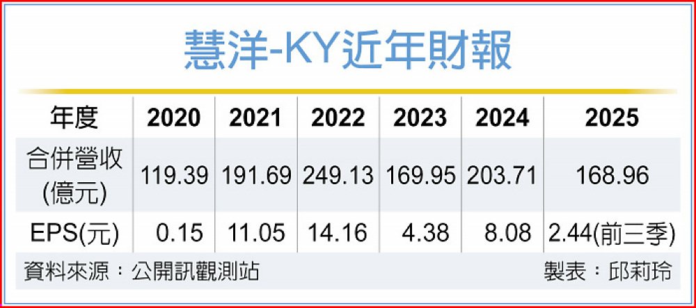 慧洋累計2025全年營收168.96億元、年減17.06%,營業利益40.39億元、年減40.48%,稅前盈餘39.55億元、年減34.67%,自結每股稅前盈餘5.3元。